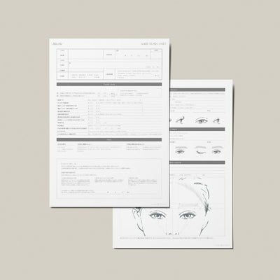 お客様のカルテ管理とデザインカウンセリングが一枚で完了するシート お名前・電話番号等の個人情報、まつ毛カールの経験、皮膚トラブルの有無などのチェック項目に加えて、普段の生活からまつ毛・眉毛のお悩みまで、お客様のご要望を分かりやすく取得できるシートです。 裏面は、デザインを記入できるようにしており、お客様と仕上がりイメージを共有しやすくなっております。
