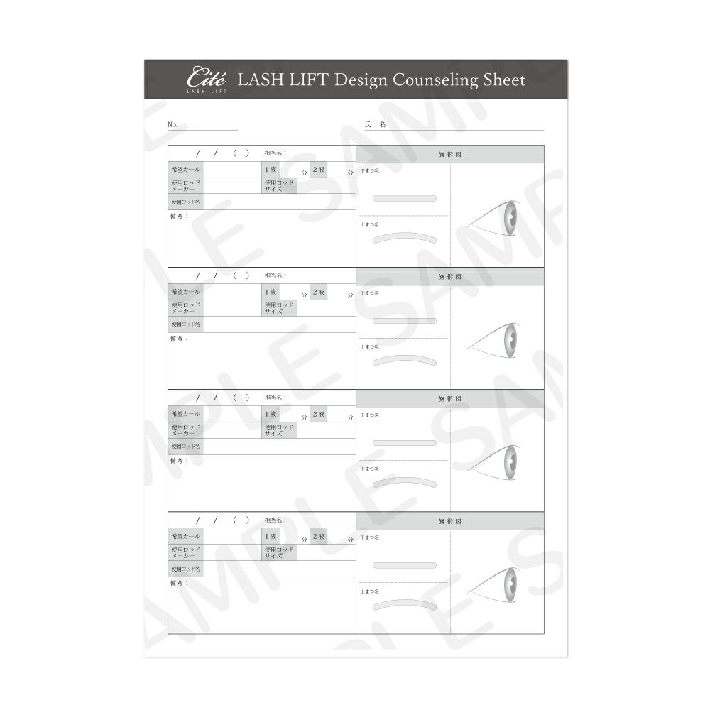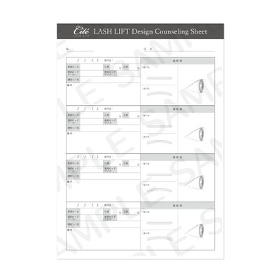 日本語、ラッシュリフト専用のデザインカウンセリングシートです。ラッシュリフト施術者の意見を基に作成しました。裏表で8 回分記入できます。