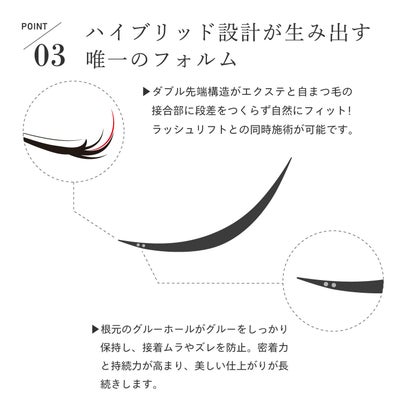 数百種類の原糸の中から、毛元から毛先までのフラット感や柔らかさ、立体感に最適な素材を厳選。ダブル先端構造により、1本でも自然なボリュームと美しい毛流れを実現し、エクステとラッシュリフトの同時施術でも優れた持続力を保ちます。