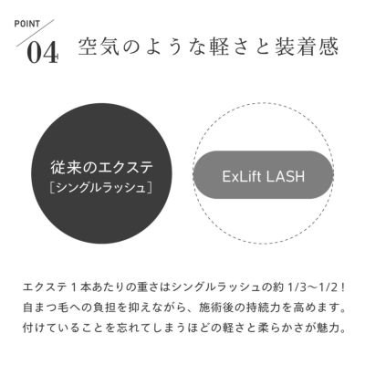 数百種類の原糸の中から、毛元から毛先までのフラット感や柔らかさ、立体感に最適な素材を厳選。ダブル先端構造により、1本でも自然なボリュームと美しい毛流れを実現し、エクステとラッシュリフトの同時施術でも優れた持続力を保ちます。