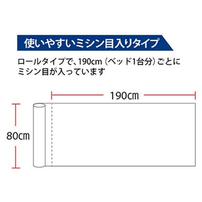 薄手タイプ(非防水)。ロールタイプのペーパーシーツ(薄手タイプ)です。190cm(ベッド1台分)ごとにミシン目が入っているため、引っ張るだけでベッド1台分ずつカットできます。十字の切れ目はありません。